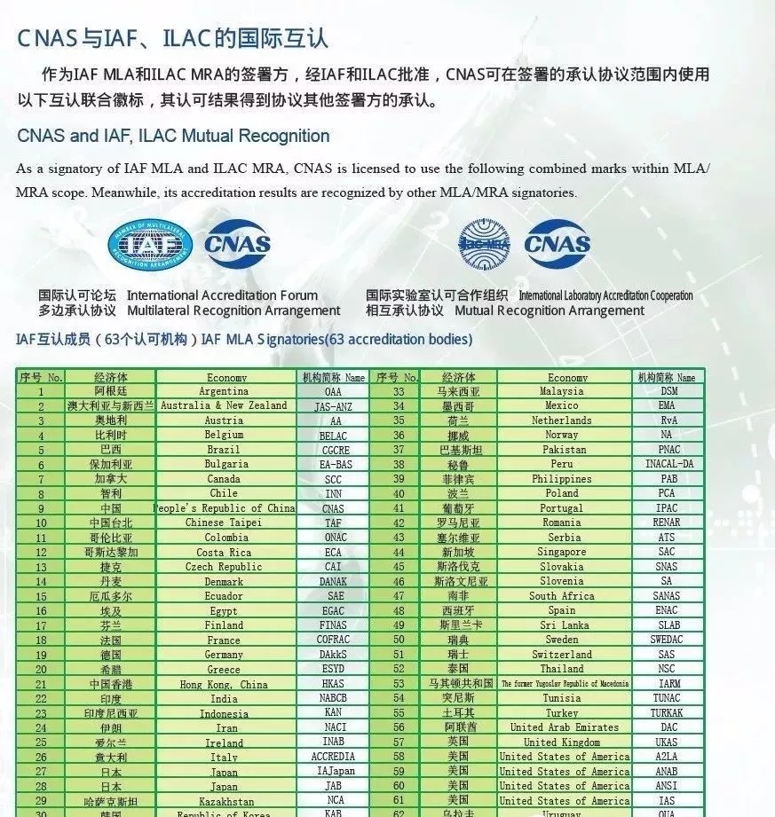 中国合格评定国家认可委员会(CNAS)是国际认可论坛(IAF)、国际实验室认可合作组织(ILAC)、亚太实验室认可合作组织(APLAC)和太平洋认可合作组织(PAC)的正式成员。