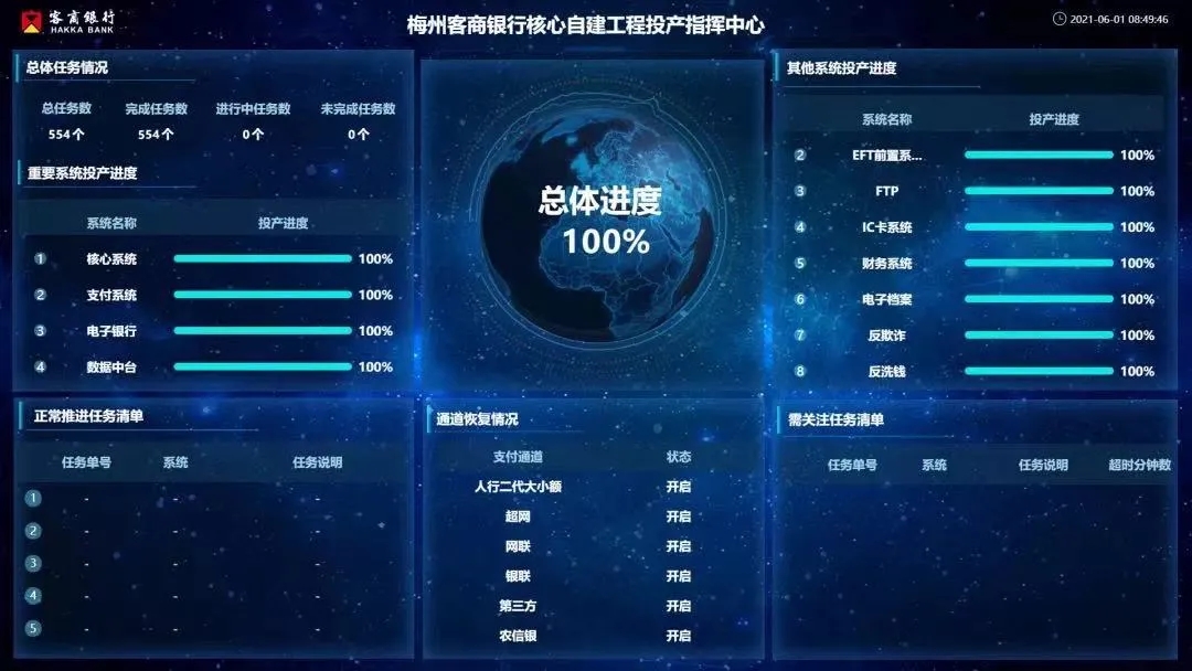 2021年6月1日上午,客商银行董事长宁远喜正式宣布:“客商银行核心自建工程投产上线成功”,标志着工程目标顺利完成,客商银行数字化发展步入快车道。