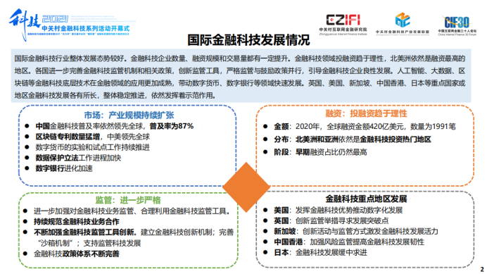 我国金融科技增长趋于稳定。在市场规模、融资金额、企业发展等方面保持稳定增长的态势。在推进数字货币和金融科技创新监管试点等方面取得一定成绩。金融科技企业加快发展,上市企业增多。北京、上海、深圳等城市金融科技发展位居国内前列,依然发挥着引领示范作用。