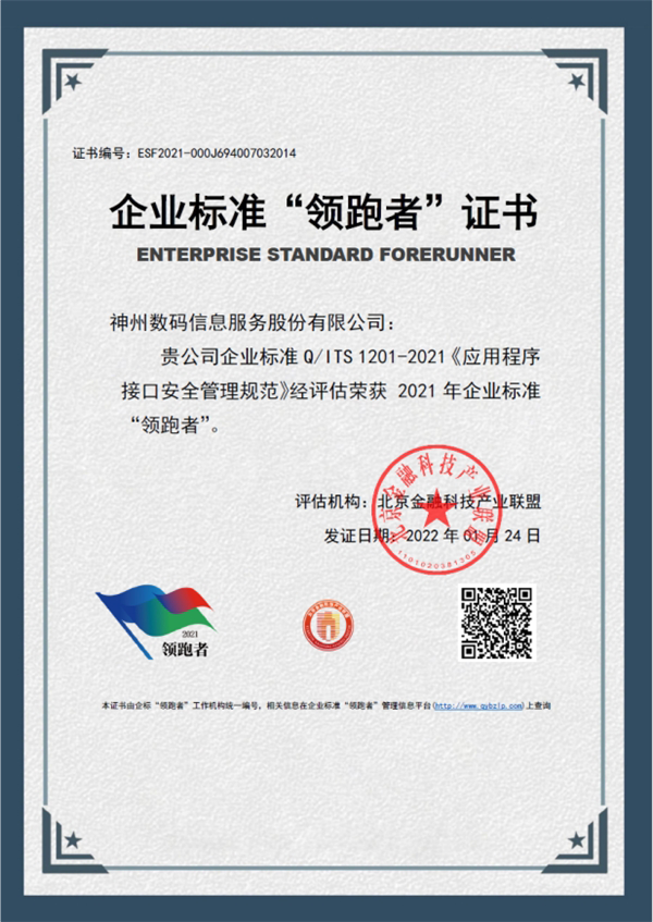 近日,企业标准领跑者管理信息平台发布了2021年金融信息服务领域企业标准“领跑者”名单,BB贝博艾弗森官网的《应用程序接口安全管理规范》经评估荣获2021年企业标准“领跑者”,成为商业银行应用程序接口领域14家入选企业中唯一的金融科技公司,展现了BB贝博艾弗森官网在金融科技行业应用创新与标准化建设的领先地位。