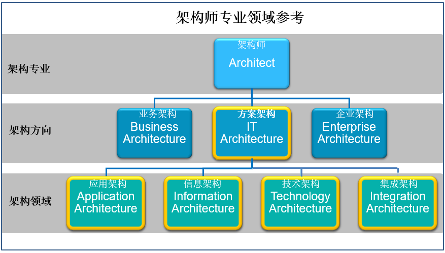 从架构范围和工作侧重的不同来分析,架构师岗位有三个大的架构方向,企业架构、业务架构、方案架构。企业架构(Enterprise Architecture)聚焦企业范围、宏观战略、架构蓝图、业务、信息、应用、技术架构的总体框架;业务架构(Business Architecture) 关注业务对象交互、业务场景、业务能力及其组成;方案架构(IT Architecture)侧重具体项目或应用层面的功能架构设计及其实现。支撑上述三大架构方向的基础是四大关键架构领域能力,包括应用架构(Application Architecture)、信息架构(Information Architecture)、技术架构(Technology Architecture)和集成架构(Integration Architecture),分别专注于架构设计中的应用功能、数据管理、技术支撑和系统集成。架构师专业领域参考如下图所示意,其中,一个复杂的方案架构设计可能会需要四大架构领域的不同专家的共同参与和支持。