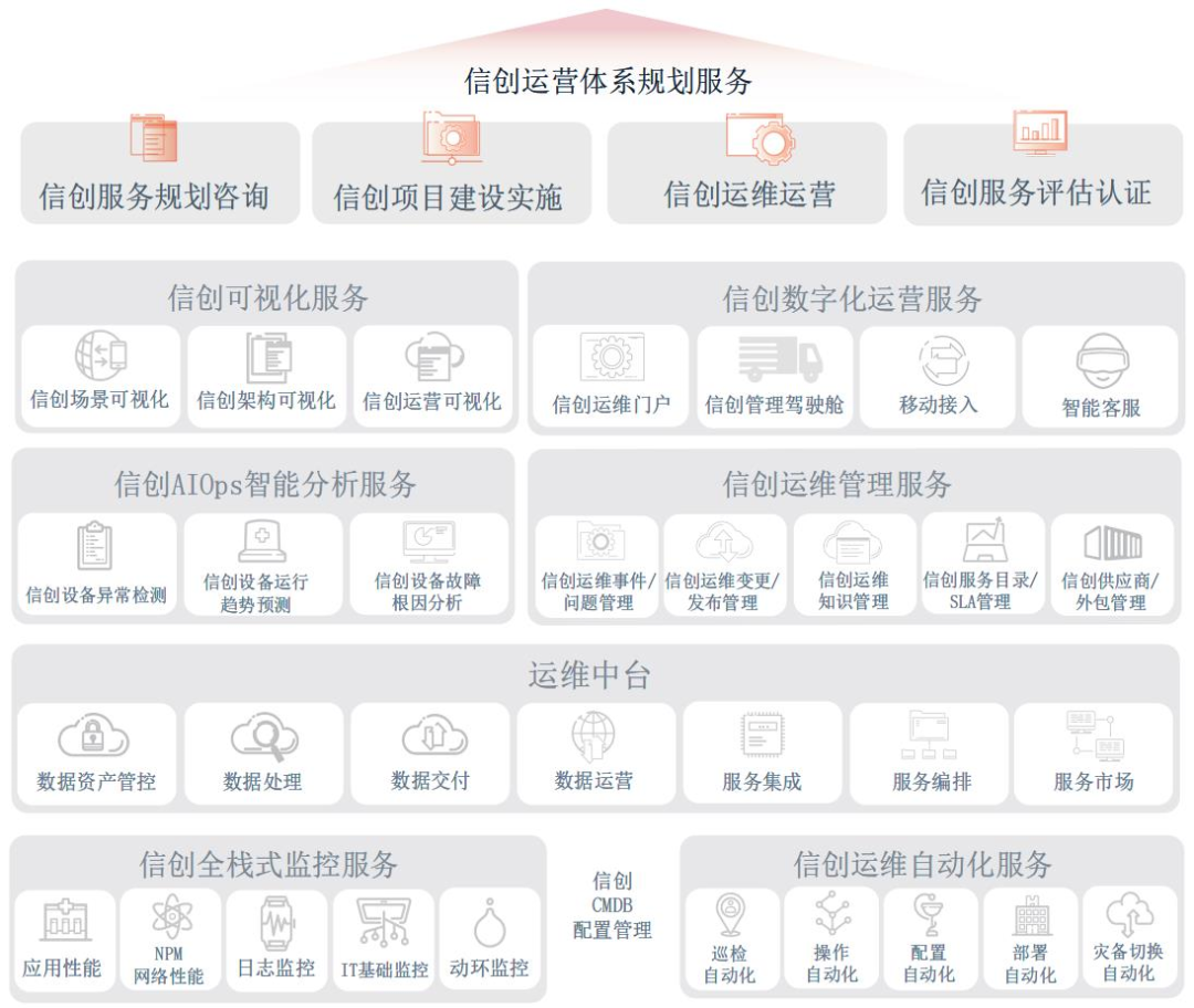 BB贝博艾弗森官网信创智能运维服务,结合信创业务特点和数字化时代对运维管理的需求,通过“监管控析”一体化智能运维解决方案,以信创客户和信创业务场景为导向,通过全业务的数据和流程整合,实现可视化、场景化、自动化、精细化的智能运维管理,提升用户体验及运维效能。包含信创可视化服务、信创数字化运营务、信创AIOps智能分析服务、信创运维管理服务、运维中台、信创全栈式监控服务、信创CMDB配置管理服务、信创运维自动化服务八大模块。