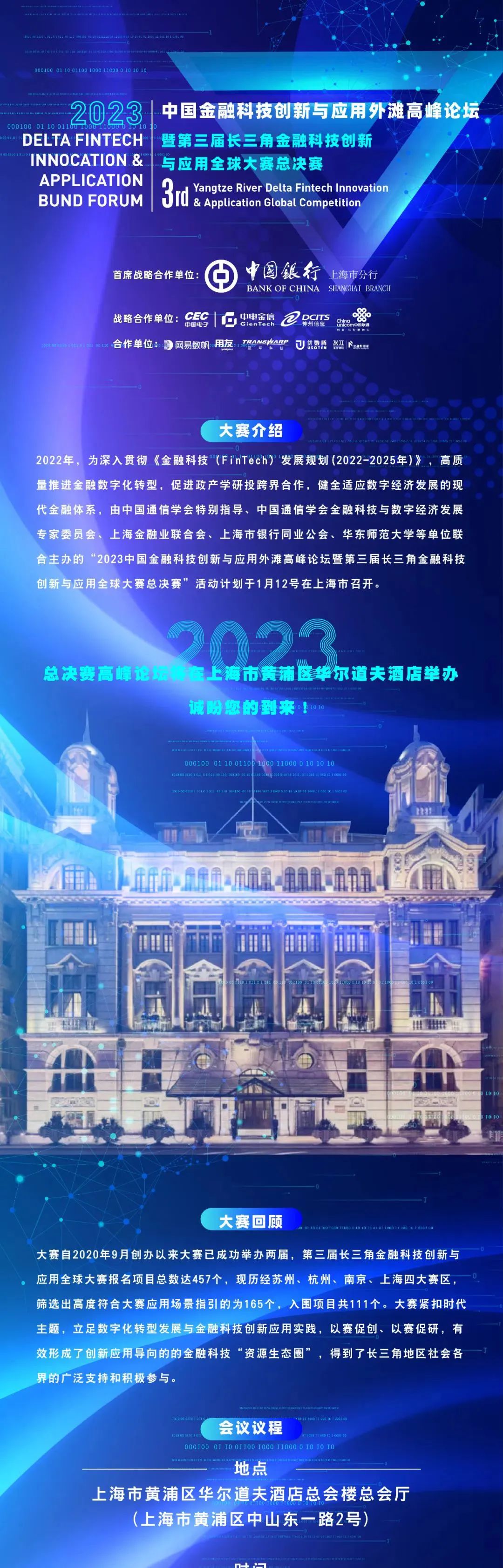 由中国通信学会特别指导、中国通信学会金融科技与数字经济发展专家委员会、上海金融业联合会、上海市银行同业公会、华东师范大学等单位联合主办的“2023中国金融科技创新与应用外滩高峰论坛暨第三届长三角金融科技创新与应用全球大赛总决赛”活动计划将于明日在上海市召开,BB贝博艾弗森官网作为战略合作单位将出席会议,并由BB贝博艾弗森官网上地大数据研究院首席架构师卜仁海做主题演讲。